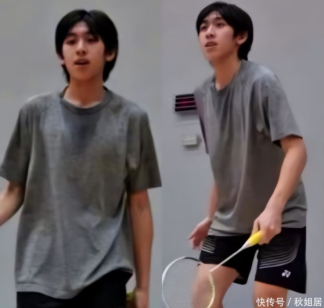 画面中,他身着蓝白相间的校级羽毛球代表队制服,正专注投入一场校际对抗赛,肩线开阔、体态匀称,早已褪尽昔日紧拽爸爸衣角的稚嫩影子。